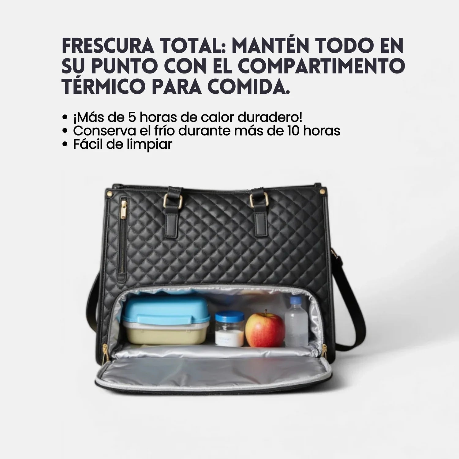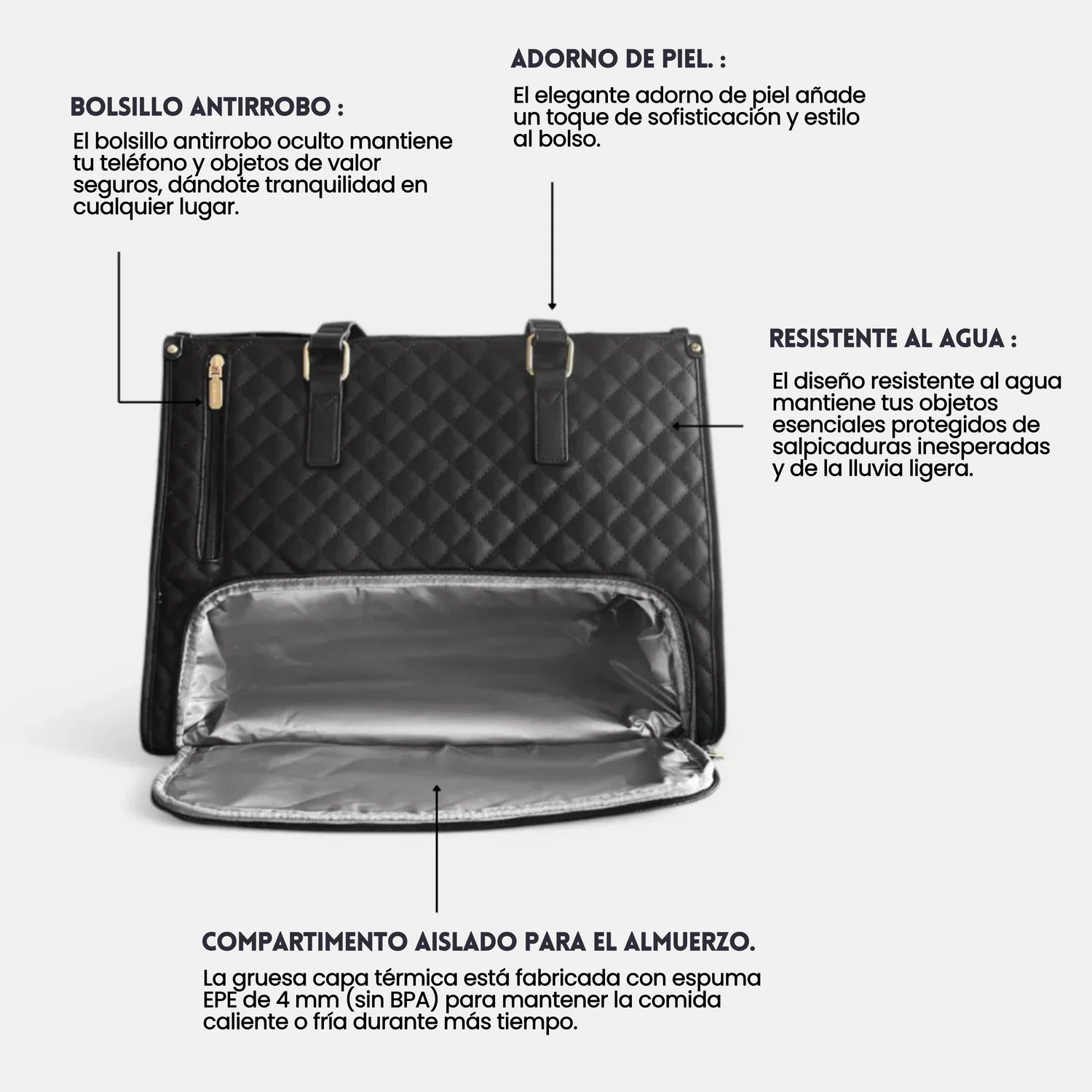 Elegante, térmico y seguro: con bolsillo antirrobo, compartimento aislado para comida y diseño resistente al agua.