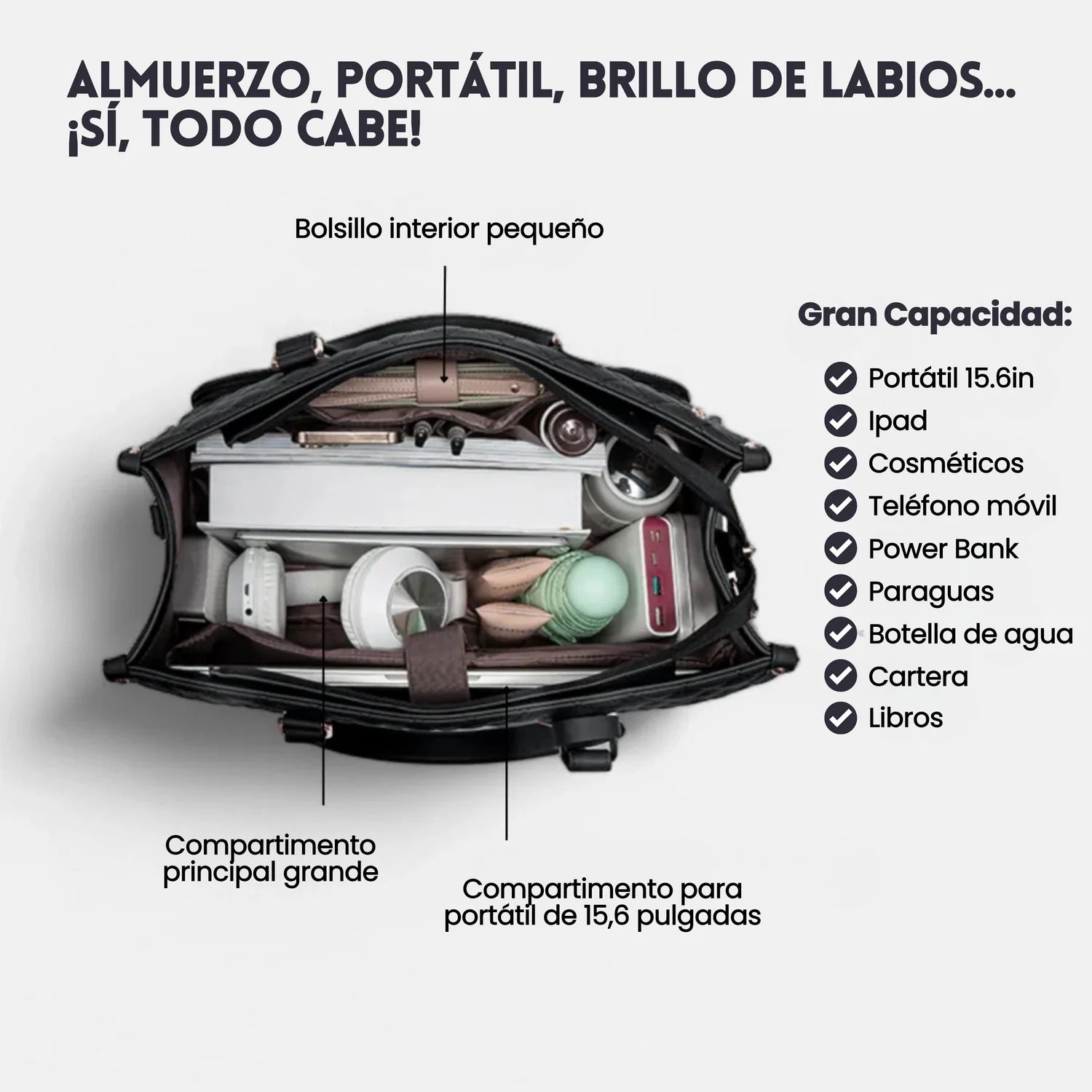 Con espacio para tu portátil de 15.6”, cosméticos, botella, móvil y mucho más, este bolso organiza todo lo que necesitas para el día… sin perder estilo.